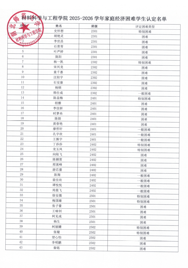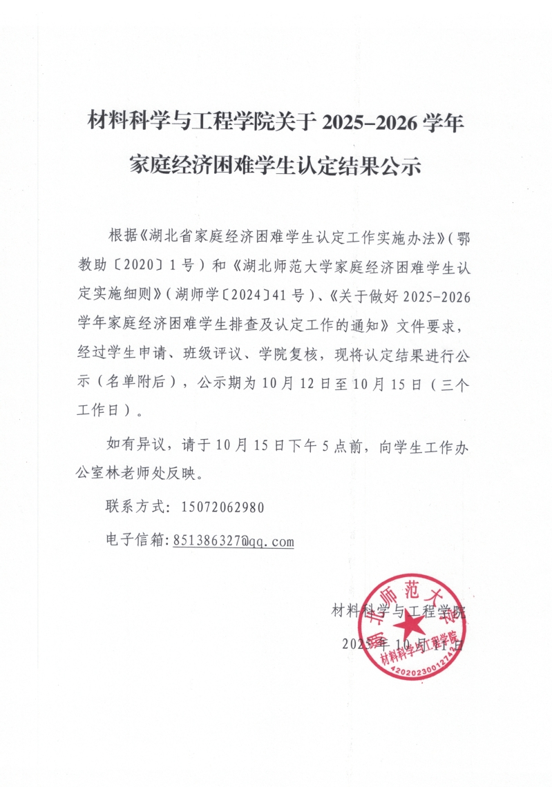 材料科学与工程学院关于2025-2026学年家庭经济困难学生认定结果公示