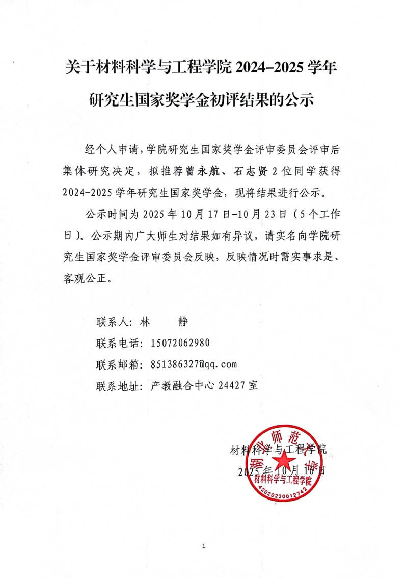 关于材料科学与工程学院2024-2025学年研究生国家奖学金初评结果的公示