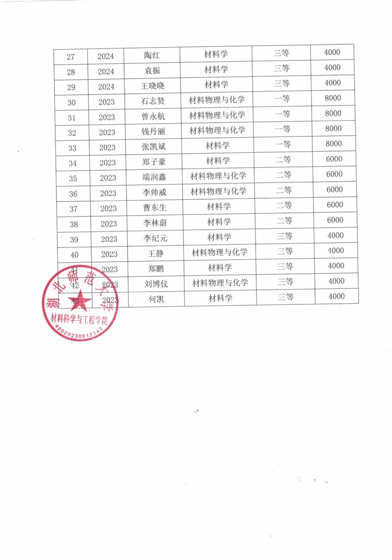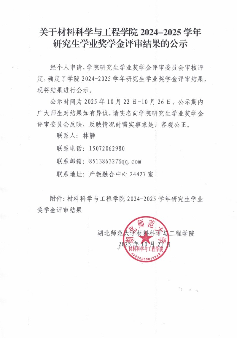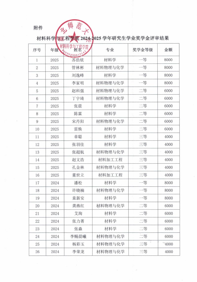 关于材料科学与工程学院2024-2025学年研究生学业奖学金评审结果的公示