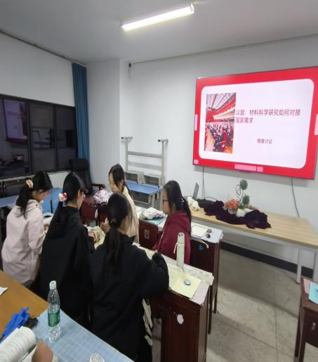 随后开展分组讨论,各班以“材料科学研究如何对接国家需求”为核心议题开展情景式研讨。同学们结合所学专业,从新能源材料研发、电池技术突破、高端装备材料创新等角度各抒己见,探讨科研方向与国家战略科技力量的契合点。讨论结束后,各班级凝聚形成“材料担当”总结感悟,明确将以实际行动回应国家需求、助力学科发展。