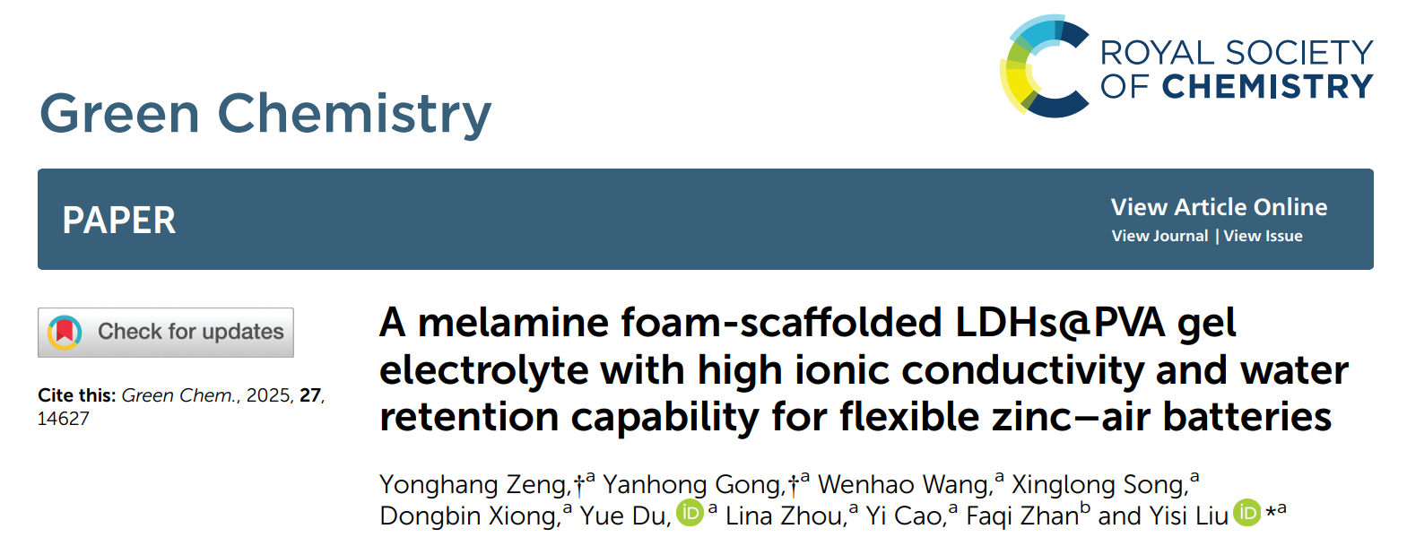 Yonghang Zeng, Yanhong Gong, Wenhao Wang, Xinglong Song, Dongbin Xiong, Yue Du, Lina Zhou, Yi Cao, Faqi Zhan, Yisi Liu*.A melamine foam-scaffolded LDHs@PVA gel electrolyte with high ionic conductivity and water retention capability for flexible zinc–air batteries.Green Chemistry, 2025, 27, 14627-14639. (中科院一区TOP期刊, IF=9.2 )