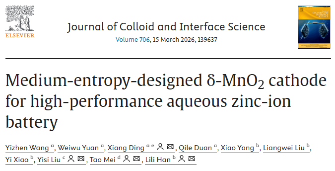 Yizhen Wang, Weiwu Yuan, Xiang Ding*, Qile Duan, Xiao Yang, Liangwei Liu, Yi Xiao,Yisi Liu*, Tao Mei*, Lili Han*. Medium-energy-designedδ-MnO2 cathode for high-performance aqueous zinc-ion battery.Journal of Colloid and Interface Science, 2026, 706, 139637.(中科院一区TOP期刊,IF=9.4)