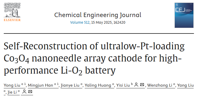Yong Liu, Mingjun Han, Jianye Liu, Yaling Huang,Yisi Liu*, Wenzhang Li, Yang Liu, Jie Li*.Self-Reconstruction of ultralow-Pt-loading Co3O4 nanoneedle array cathode for high-performance Li-O2 battery.Chemical Engineering Journal, 2025, 512: 162420.(中科院一区TOP期刊,IF=13.4)