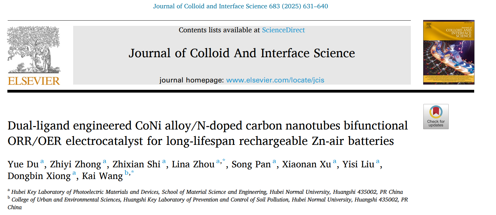 Yue Du, Zhiyi Zhong, Zhixian Shi, Lina Zhou*, Song Pan, Nanxiao Xu, Yisi Liu, Dongbin Xiong, Kai Wang*.Dual-ligand engineered CoNi alloy/N-doped carbon nanotubes bifunctional ORR/OER electrocatalyst for long-lifespan rechargeable Zn-air batteries. Journal of Colloid and Interface Science, 2025, 683, 631-640. (中科院一区TOP期刊,IF=9.4)