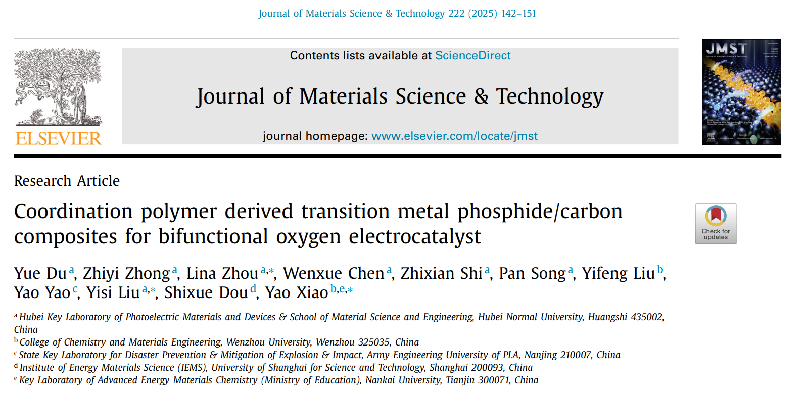 Yue Du*, Zhiyi Zhong, Wenxue Chen, Zhixian Shi, Yifeng Liu, Lina Zhou, Yisi Liu*, Yao Xiao*.Coordination polymer derived transition metal phosphide/carbon composites for bifunctional oxygen electrocatalyst.Journal of Materials Science & Technology, 2025, 222, 142-151.(中科院一区TOP期刊,IF=11.2)