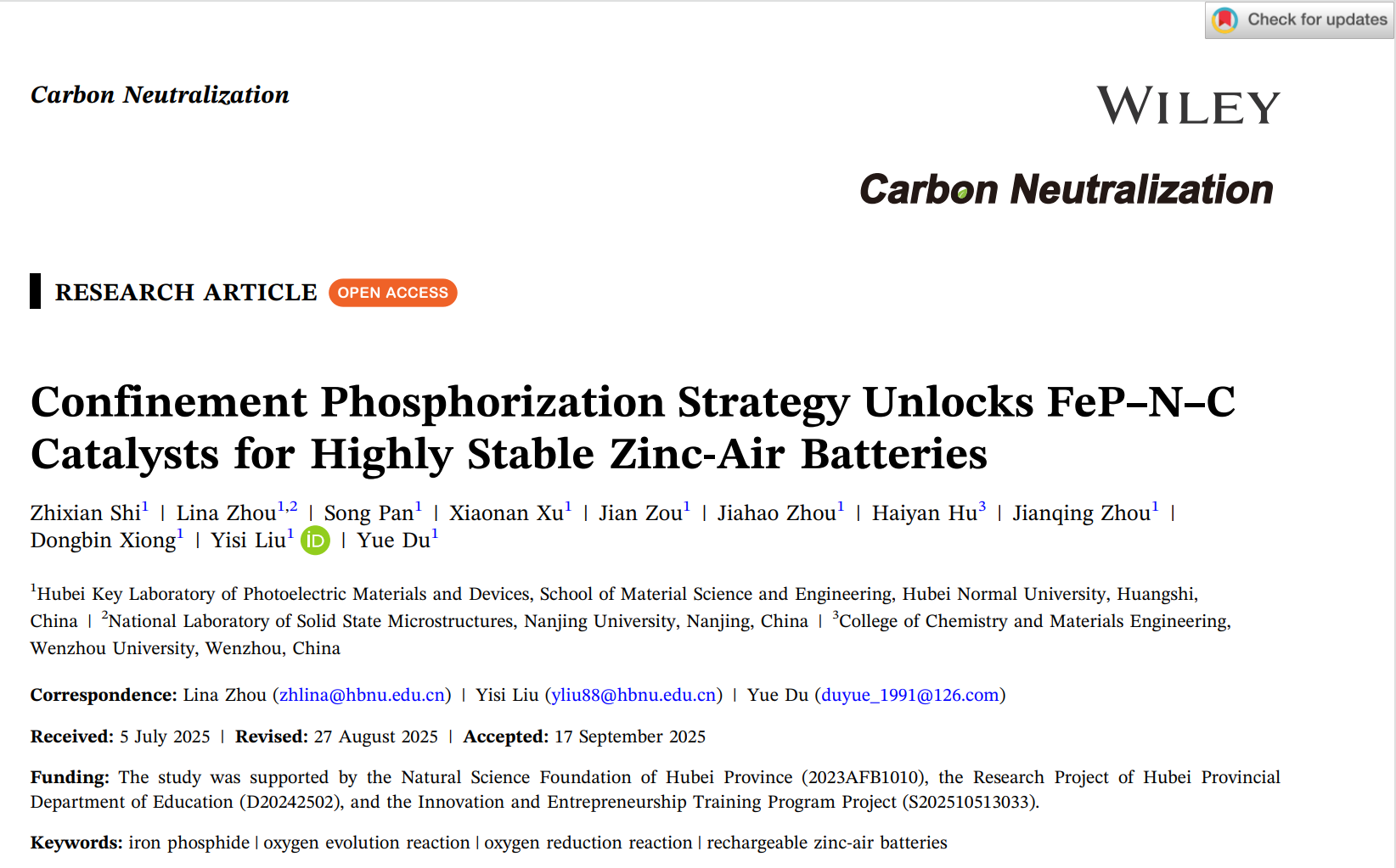 Zhixian Shi, Lina Zhou*, Song Pan, Xiaonan Xu, Jian Zou, Jiahao Zhou, Haiyan Hu, Jianqing Zhou, Dongbin Xiong, Yisi Liu*, Yue Du*.Confinement phosphorization strategy unlocks FeP–N–C catalysts for highly stable Zinc‐air.Carbon Neutralization, 2025, e70065. (中国科技期刊卓越行动计划高起点新刊, IF= 12, 封面论文)