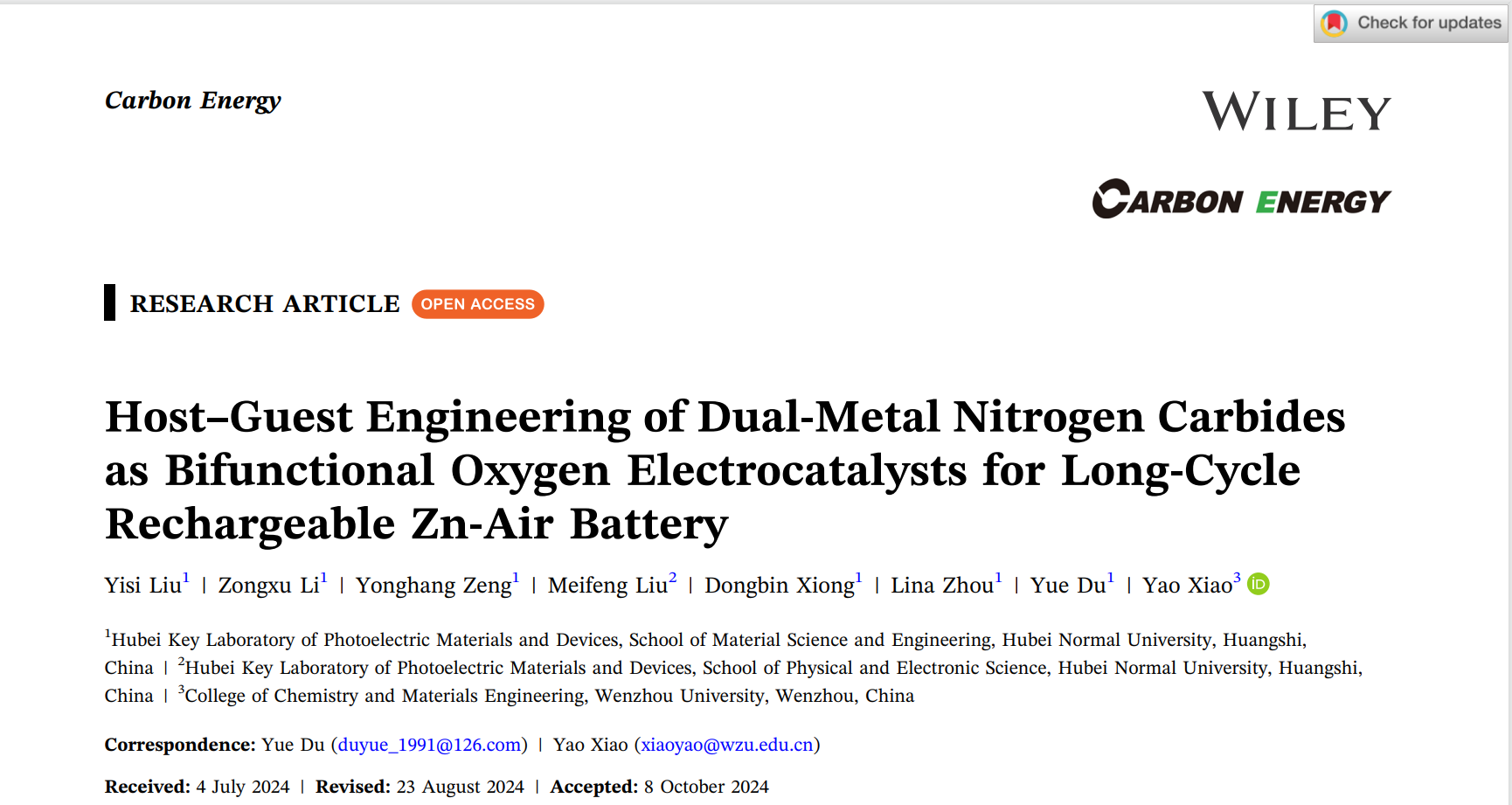 Yisi Liu, Zongxu Li, Yonghang Zeng, Meifeng Liu, Dongbin Xiong, Lina Zhou, Yue Du*, Yao Xiao*. Host-guest engineering of dual-metal nitrogen carbides as bifunctional oxygen electrocatalysts for long-cycle rechargeable Zn-air battery. Carbon Energy, 2025, e682. (中科院一区TOP期刊,IF=19.5)