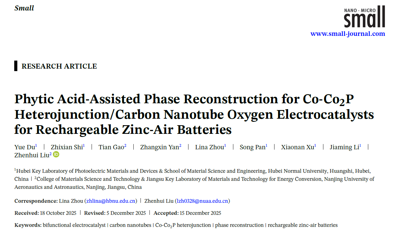 Yue Du,Zhixian Shi,Tian Gao,Zhangxin Yan,Lina Zhou*,Song Pan,Xiaonan Xu,Jiaming Li,Zhenhui Liu*. Phytic acid-assisted phase reconstruction for Co-Co2P heterojunction/carbon nanotube oxygen electrocatalysts for rechargeable Zinc-air batteries. Small, 2026, DOI:10.1002/smll.202512867. (中科院二区TOP期刊, IF= 12.1)