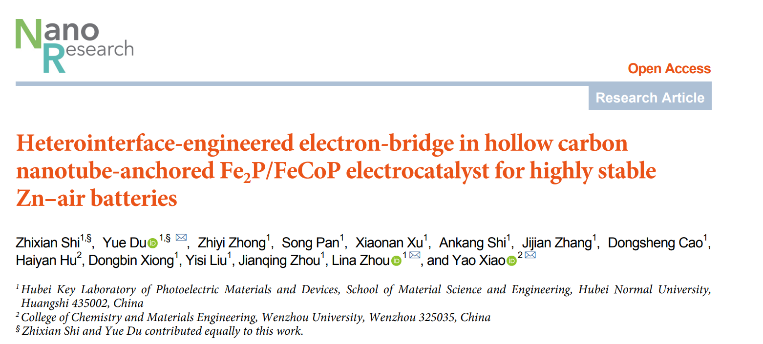Zhixian Shi, Yue Du*, Zhiyi Zhong, Song Pan, Xiaonan Xu, Ankang Shi, Jijian Zhang, Dongsheng Cao, Haiyan Hu, Dongbin Xiong, Yisi Liu, Jianqing Zhou, Lina Zhou*, Yao Xiao*.Heterointerface-engineered electron-bridge in hollow carbon nanotube-anchored Fe2P/FeCoP electrocatalyst for highly stable Zn-air batteries.Nano Research, 2026, 19(1), 94908015.(中科院一区TOP期刊, IF=9)