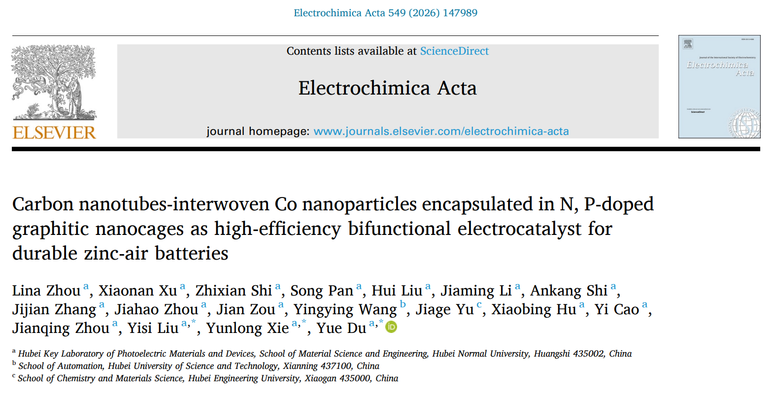 Lina Zhou, Xiaonan Xu, Zhixian Shi, Song Pan, Hui Liu, Jiaming Li, Ankang Shi, Jijian Zhang, Jiahao Zhou, Jian Zou, Yingying Wang, Jiage Yu, Xiaobing Hu, Yi Cao, Jianqing Zhou,Yisi Liu*,Yunlong Xie*, Yue Du*.Carbon nanotubes-interwoven Co nanoparticles encapsulated in N, P-doped graphitic nanocages as high-efficiency bifunctional electrocatalyst for durable zinc-air batteries.Electrochimica Acta, 2026, 147989. (中科院二区TOP期刊, IF= 5.6)