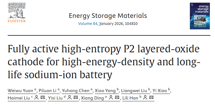 Weiwu Yuan, Piluan Li, Yuhong Chen, Xiao Yang, Liangwei Liu, Yi Xiao, Haimei Liu*,Yisi Liu*, Xiang Ding*, Lili Han*.Fully active high-entropy P2 layered-oxide cathode for high-energy-densityand long-life sodium-ion battery.Energy Storage Materials,2026, 84, 104810.(中科院一区TOP期刊,IF=20.2)