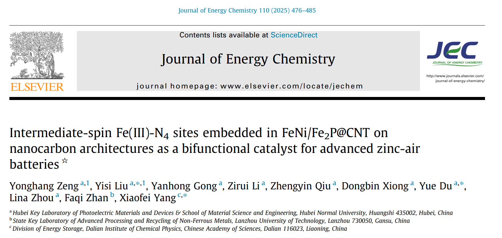 2025年7月,Journal of Energy Chemistry(《能源化学学报》)在线发表研究成果,论文题为“Intermediate-spin Fe(III)-N4 sites embedded in FeNi/Fe2P@CNT on nanocarbon architectures as a bifunctional catalyst for advanced zinc-air batteries”(嵌入纳米碳结构中FeNi/Fe2P@CNT的中自旋Fe(III)-N4位点作为先进锌空气电池双功能催化剂)。湖北师范大学为第一通讯单位,材料科学与工程学院23级硕士研究生曾永航为第一作者,杜岳、刘易斯副教授和中科院大连化物所杨晓飞研究员为论文通讯作者。Journal of Energy Chemistry为中科院一区TOP期刊(能源领域期刊排名7/299),影响因子为9.7。