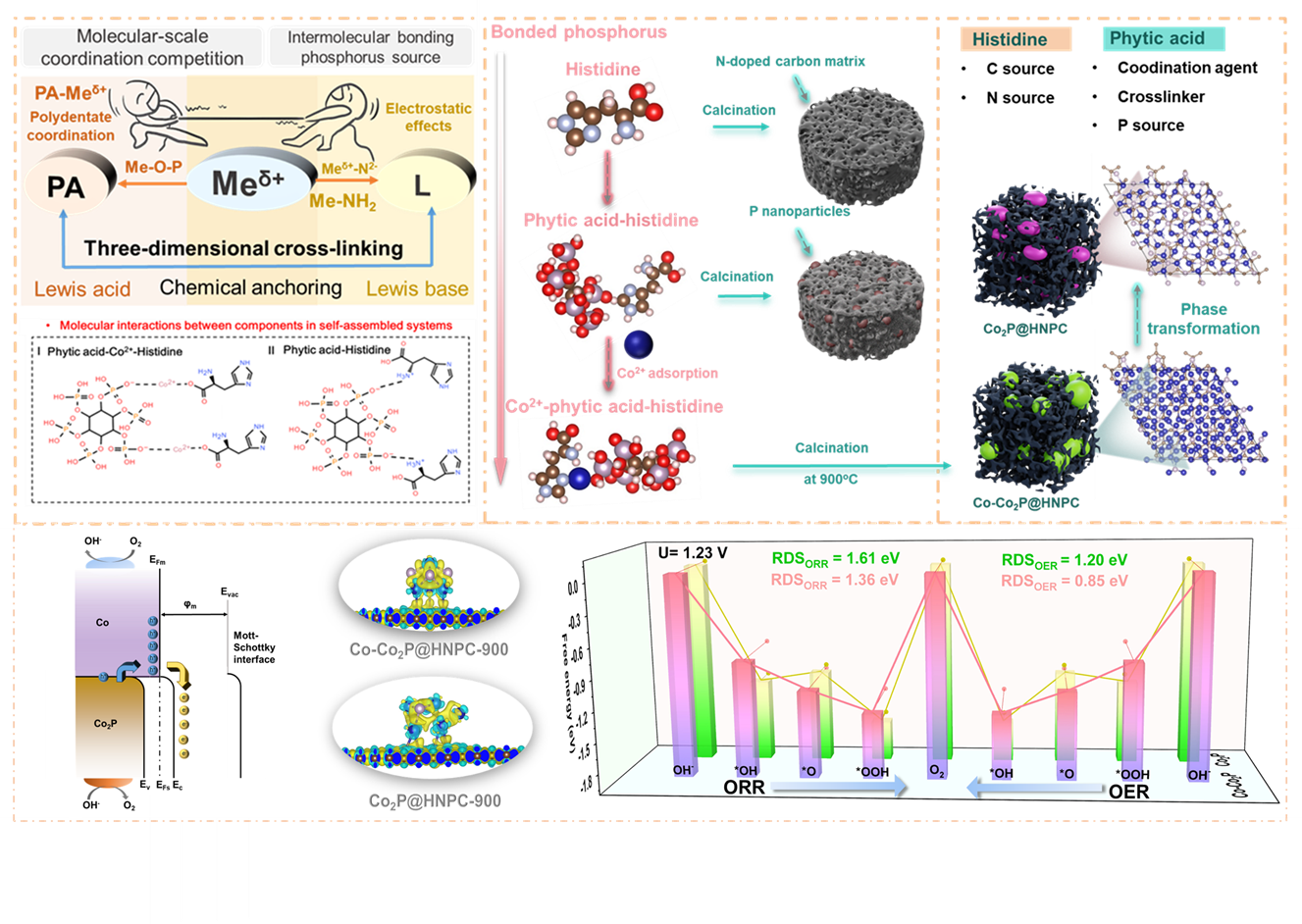 近日,院杜岳副教授团队首次在材料科学领域国际权威期刊Materials Science & Engineering R上发表题为“A bonded phosphorus source strategy for Co-Co2P heterojunction catalysts via In Situ phase reconstruction toward long-life zinc-air batteries(键合磷源策略介导原位相重构制备Co-Co2P异质结催化剂-实现长寿命锌空气电池)”的实验研究论文。研究提出了一种创新的键合磷源新策略,该方法有效规避了传统共热磷化产生有毒PH3气体、刻蚀磷化反应可控性差的弊端,通过配位吸附作用精准构筑前驱体,成功实现钴纳米颗粒的可控磷化与Co-Co2P异质结的原位相重构,为高性能空气电池阴极材料的合成提供了全新、可放大的工业化策略。