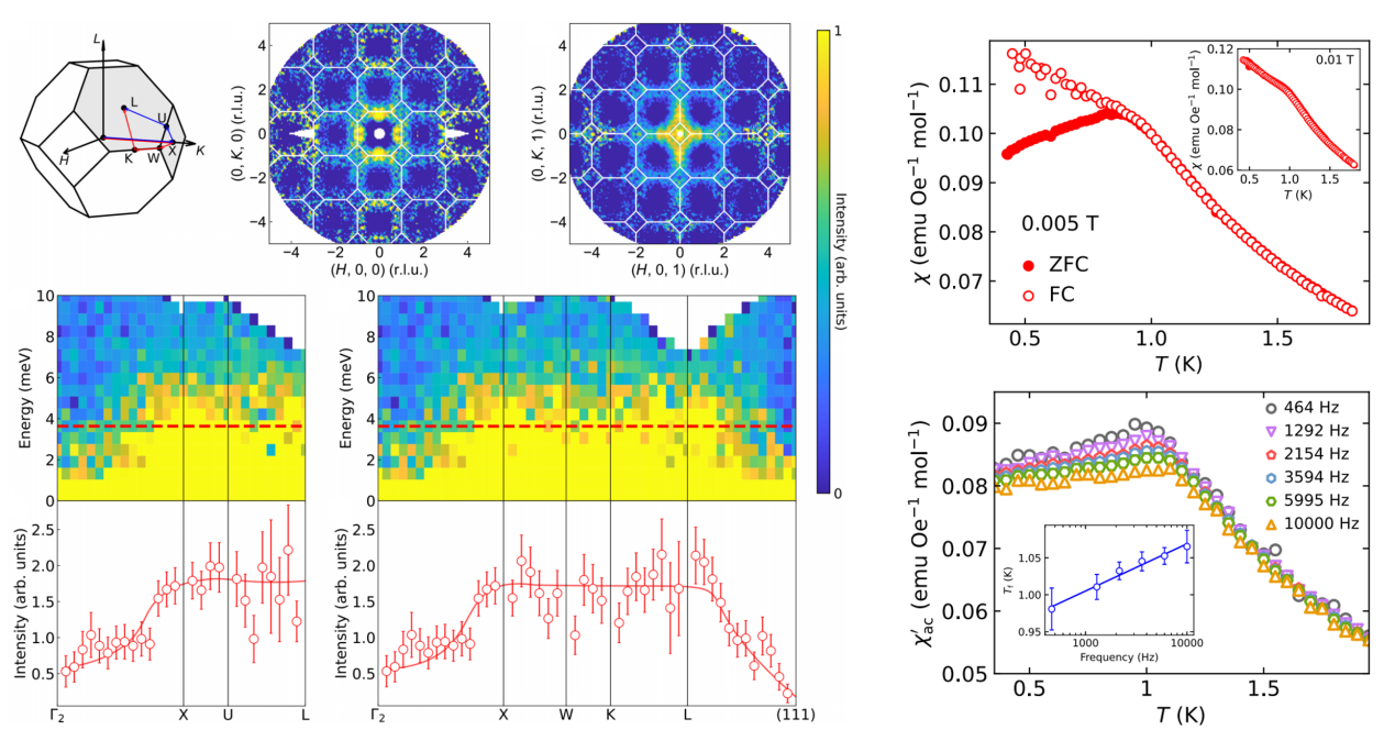 成果三:除了三角晶格之外,尖晶石结构中也存在几何阻挫,是实现量子自旋液体的潜力候选体系之一。然而,当前结构无序对自旋液体行为的影响仍存在争议。本研究结合中子散射、磁化率和比热等实验手段,对有明显结构无序的尖晶石单晶CuGa2O4进行了系统性研究。实验发现,即使温度低至80 mK 时体系仍无长程磁序建立,且非弹性中子散射实验测到了沿布里渊区边界的连续磁激发谱,这与量子自旋液体中期望的分数化准粒子激发一致。然而,直/交流磁化率曲线在0.88 K处发现短程关联和自旋冻结现象,说明其基态并非量子自旋液体。以上结果不仅揭示了结构无序可以塑造材料的自旋动力学行为,也为进一步寻找结构理想的量子自旋液体材料提供了重要参考。该研究成果以“Disorder-induced spin excitation continuum and spin-glass ground state in the inverse spinel CuGa2O4”为题,2025年7月发表于Physical Review B [PRB 112, 035128 (2025)]。我校马祯副教授、美国布鲁克海文国家实验室顾根大教授和J. M. Tranquada教授,以及南京大学温锦生教授为共同通讯作者。