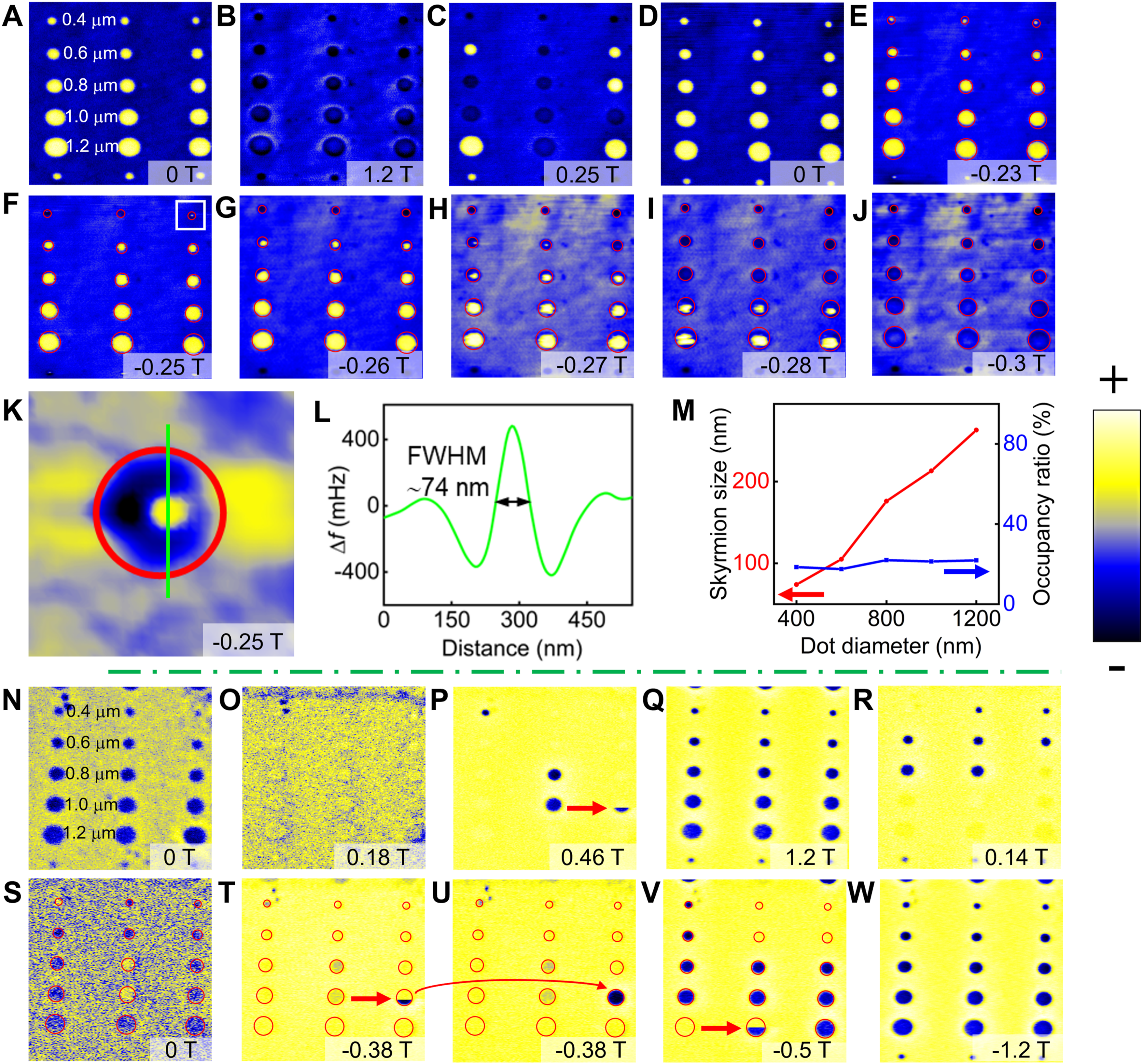 成果一:实现对单个斯格明子的可寻址、高精度调控,特别是在室温条件下的稳定操控,是该领域面临的最核心问题。本研究基于Co/Pt多层人工反铁磁耦合纳米盘阵列结构,通过自研高灵敏磁力显微镜系统,在室温条件下引入周期性局域振荡磁场,实现了对单个斯格明子尺寸的连续、可分辨调控。实验结果表明,在保持外加静态磁场不变的情况下,仅通过局域周期性磁场扫描操作,即可实现斯格明子尺寸从数百纳米连续缩小至数十纳米,尺寸缩小接近一个数量级。同时,斯格明子的写入、删除以及局部形貌精细调控均可实现,展示出优异的可控性和可重复性。该研究为为拓扑自旋结构的工程化应用和低功耗自旋电子学发展提供了新的实验基础。该研究成果以“Giant Tunability of Individual Magnetic Skyrmion Size Via an Oscillating Local Magnetic Field”为题,发表在Rare Metals(中科院一区,TOP期刊,IF=11)上,并且,该工作被选为期刊封面。谢彩红博士为论文第一作者,南京师范大学马付胜教授、中国科学院强磁场科学中心冯启元副教授、中国科学技术大学陆轻铀教授为论文共同通讯作者。湖北师范大学光电转换材料与器件湖北省重点实验室、材料科学与工程学院为第一通讯单位。